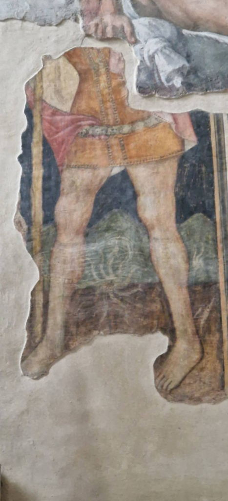 Nella parte destra dell’affresco, a mezza altezza, il gruppo delle figure che stanno sotto alla Croce è sovrastato da un personaggio più in alto, un santo barbuto di cui restano parti della testa e del corpo, Sant’Antonio Abate.