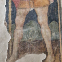 Nella parte destra dell’affresco, a mezza altezza, il gruppo delle figure che stanno sotto alla Croce è sovrastato da un personaggio più in alto, un santo barbuto di cui restano parti della testa e del corpo, Sant’Antonio Abate.