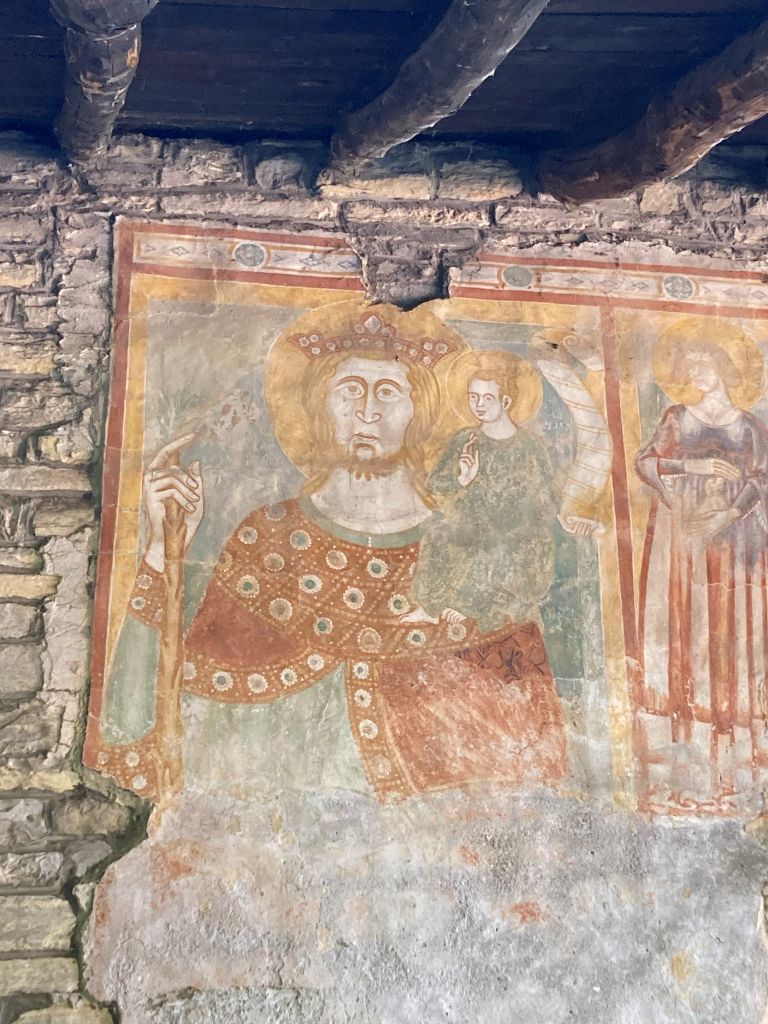 - Quarona Val Sesia (Vercelli), Chiesa di san Giovanni al Monte: Affresco del XIII secolo. Cristoforo rappresentato con la corona di re.