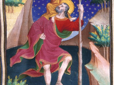 Il piede destro è di profilo, puntato verso la riva sinistra; il viso, e più lo sguardo, sono orientati all’indietro. Un san Cristoforo che si muove, insomma. Un san Cristoforo anziano, con una lunga barba bianca, come è spesso raffigurato presso i fiamminghi. I colori degli abiti sono vivaci, come quelli del fiume che attraversa. Sullo sfondo ci sono mura e un campanile in un paesaggio montuoso. Nell’acqua si intravede un animale dalla coda biforcuta e dalla testa di drago.
