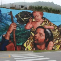 Nel murales “The Human Condition” (2016) di Gaia a Monno, San Cristoforo è il simbolo più potente. Rappresentato in modo tradizionale ma innovativo, trasporta il Bambino avvolto in una coperta termica dorata, richiamando le moderne migrazioni e le politiche europee. San Cristoforo incarna la figura dell’adulto che protegge e accompagna il migrante, un ponte tra passato e presente, tra fede e realtà umana, sottolineando l’universalità della migrazione.