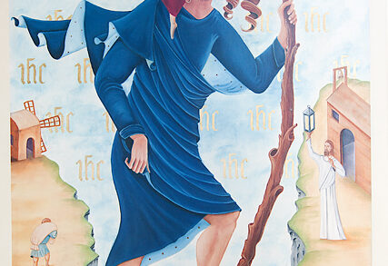 Nell’acquerello, un giovane Cristoforo, con la testa completamente piegata e rivolta verso il basso, trasporta faticosamente (vedasi anche la gamba piegata) un Bambino, seduto comodamente a cavalcioni della spalla del santo che si appoggia ad un bastone – albero; è notte (come ci segnala la falce delle luna nel cielo) e l’atmosfera del quadretto è quasi onirica.